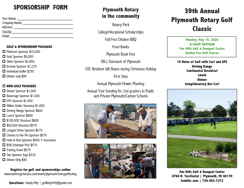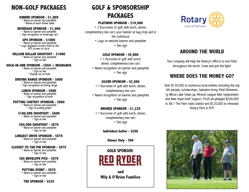 The Rotary Club runs its business with 100% of its donations going directly to Local, State, National & World needs. Our Plymouth Club has hundreds of business owners, all of whom are volunteering their time to make this golf event a success!
